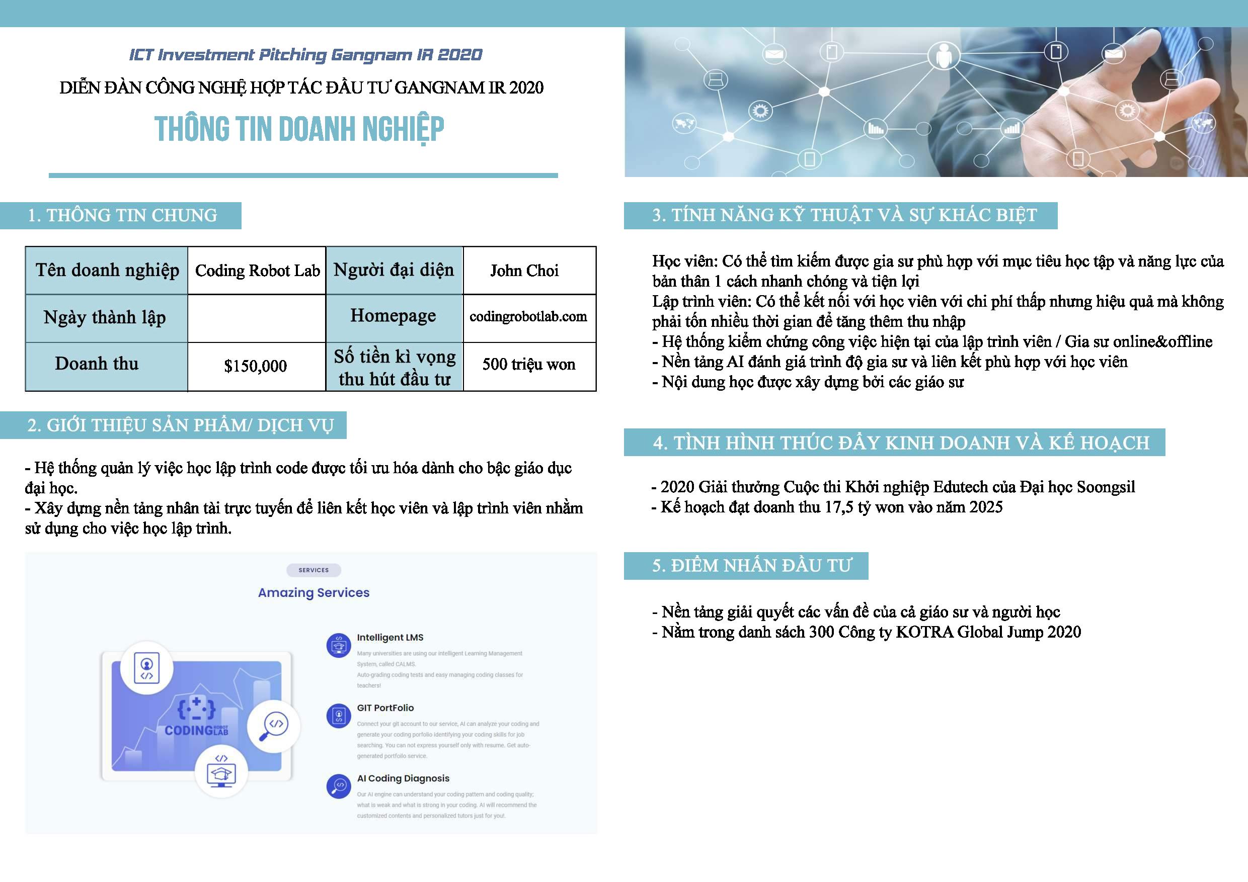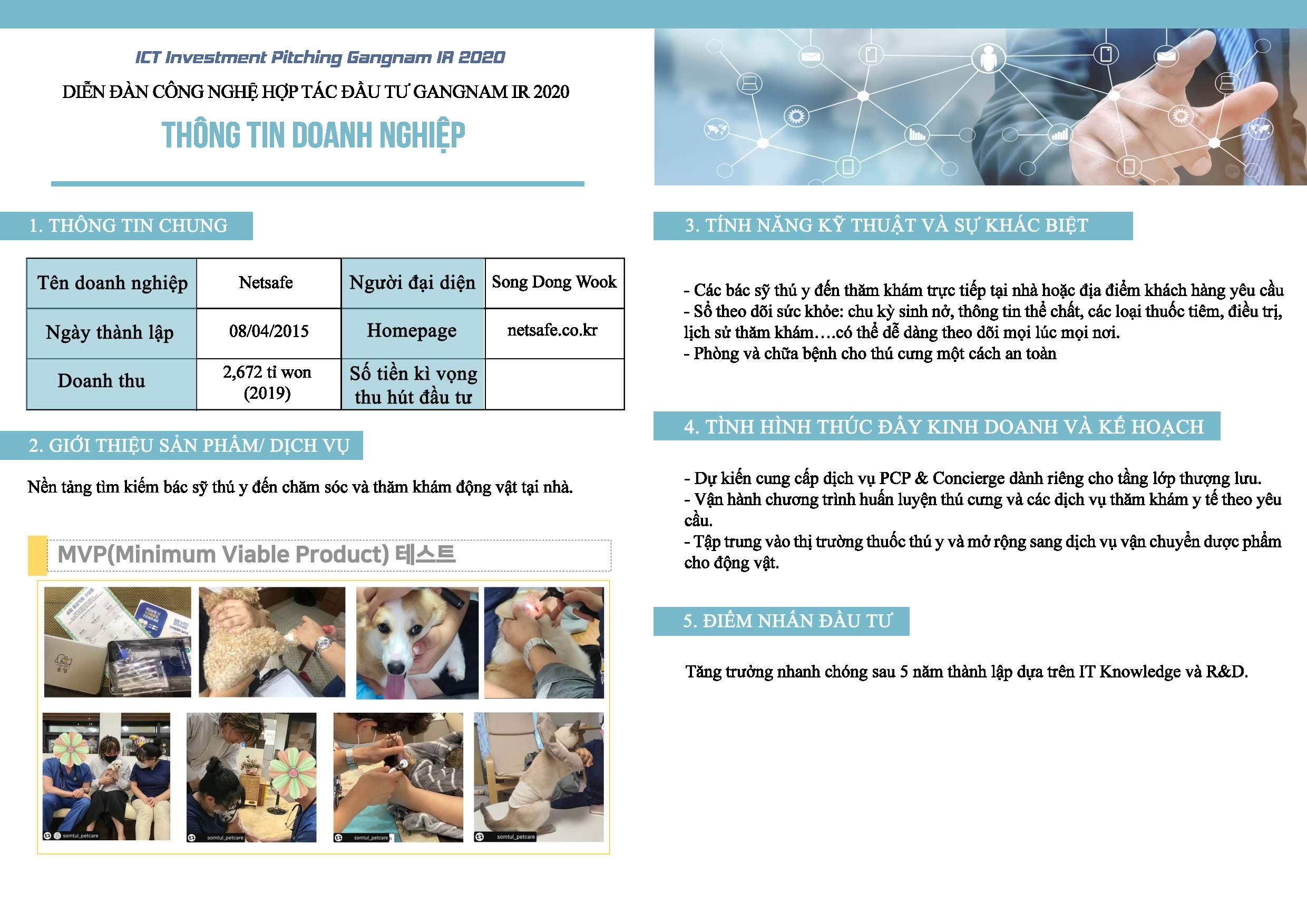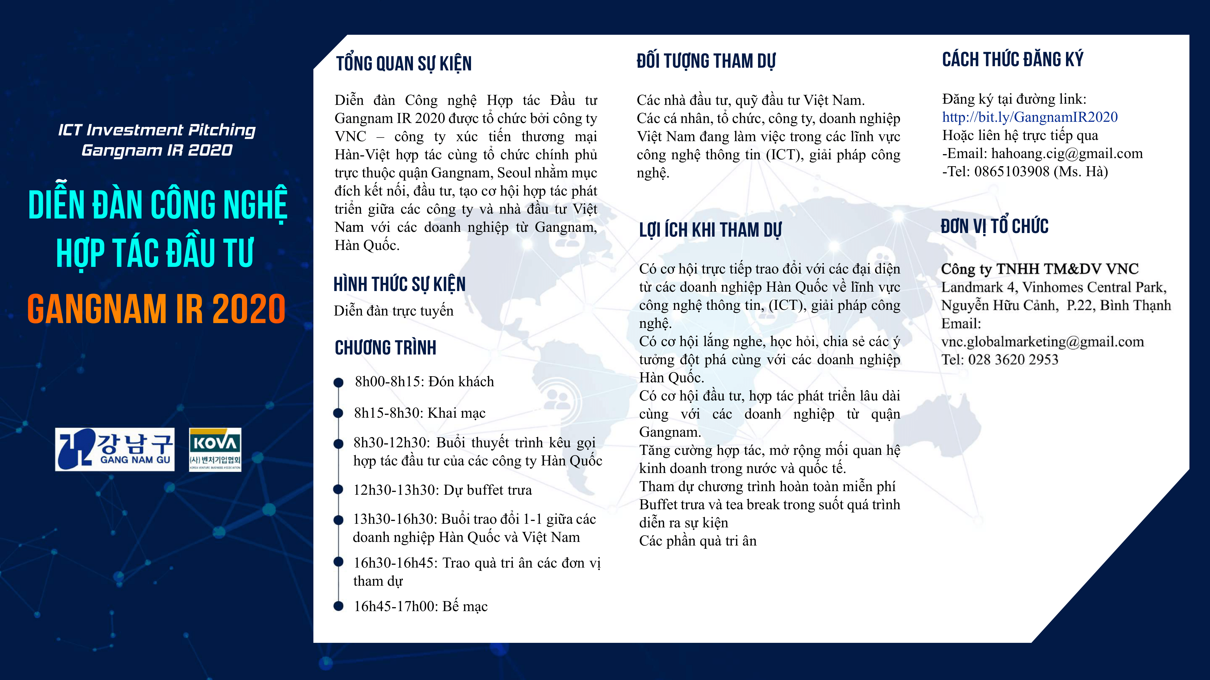 Tiếp nối sự thành công của diễn đàn đầu tiên được VNC tổ chức vào năm 2019 đã kết nối nhiều doanh nghiệp Hàn Quốc với các doanh nghiệp Việt Nam cùng bắt tay phát triển thị trường, diễn đàn công nghệ hợp tác đầu tư Gangnam IR 2020 với sự đồng hành của Vườn Ươm Khởi Nghiệp Việt trong phần tập huấn hướng dẫn các công ty Hàn Quốc tham dự kỳ này cách thức để kêu gọi vốn và hợp tác từ các công ty Việt Nam.